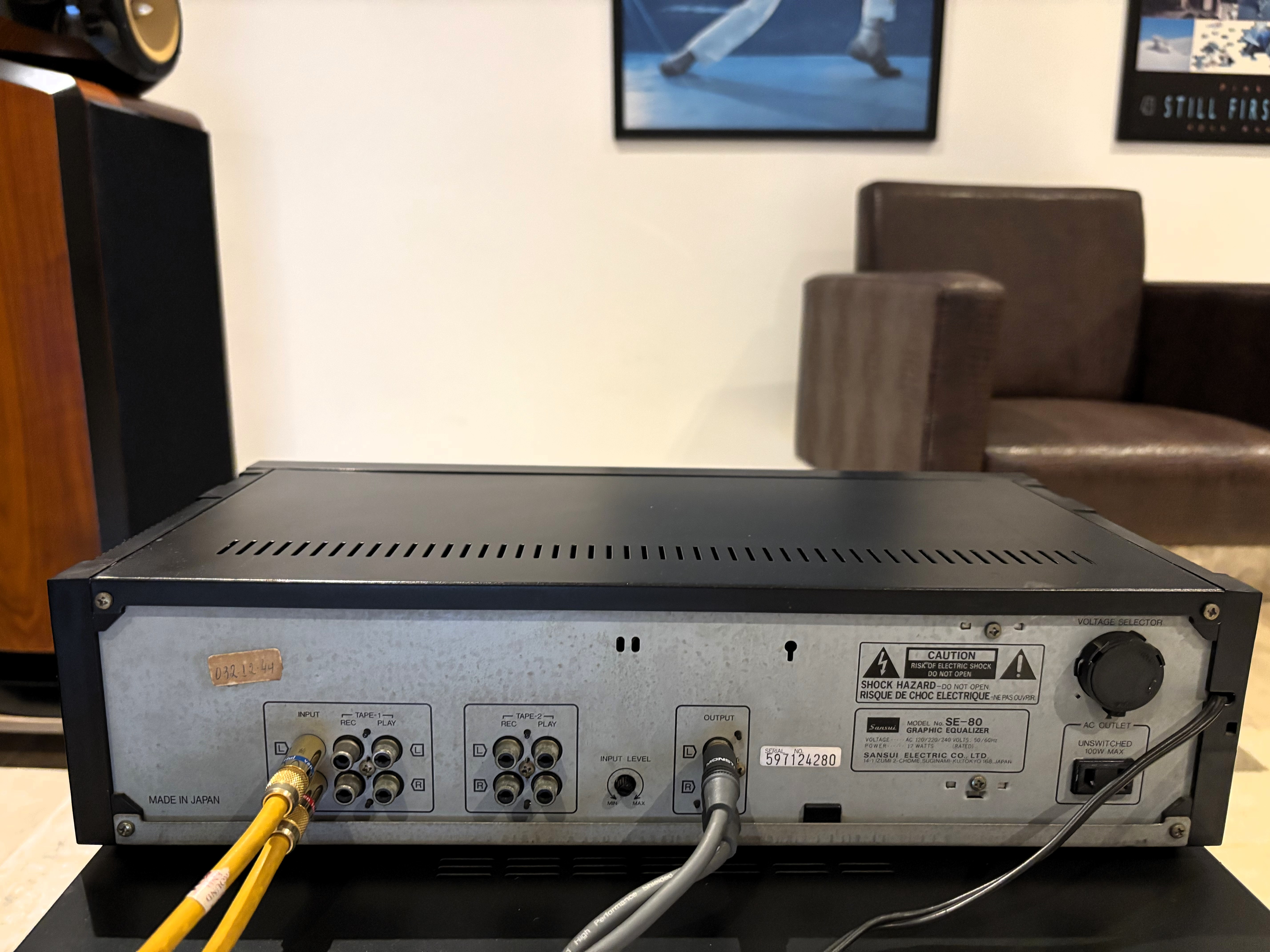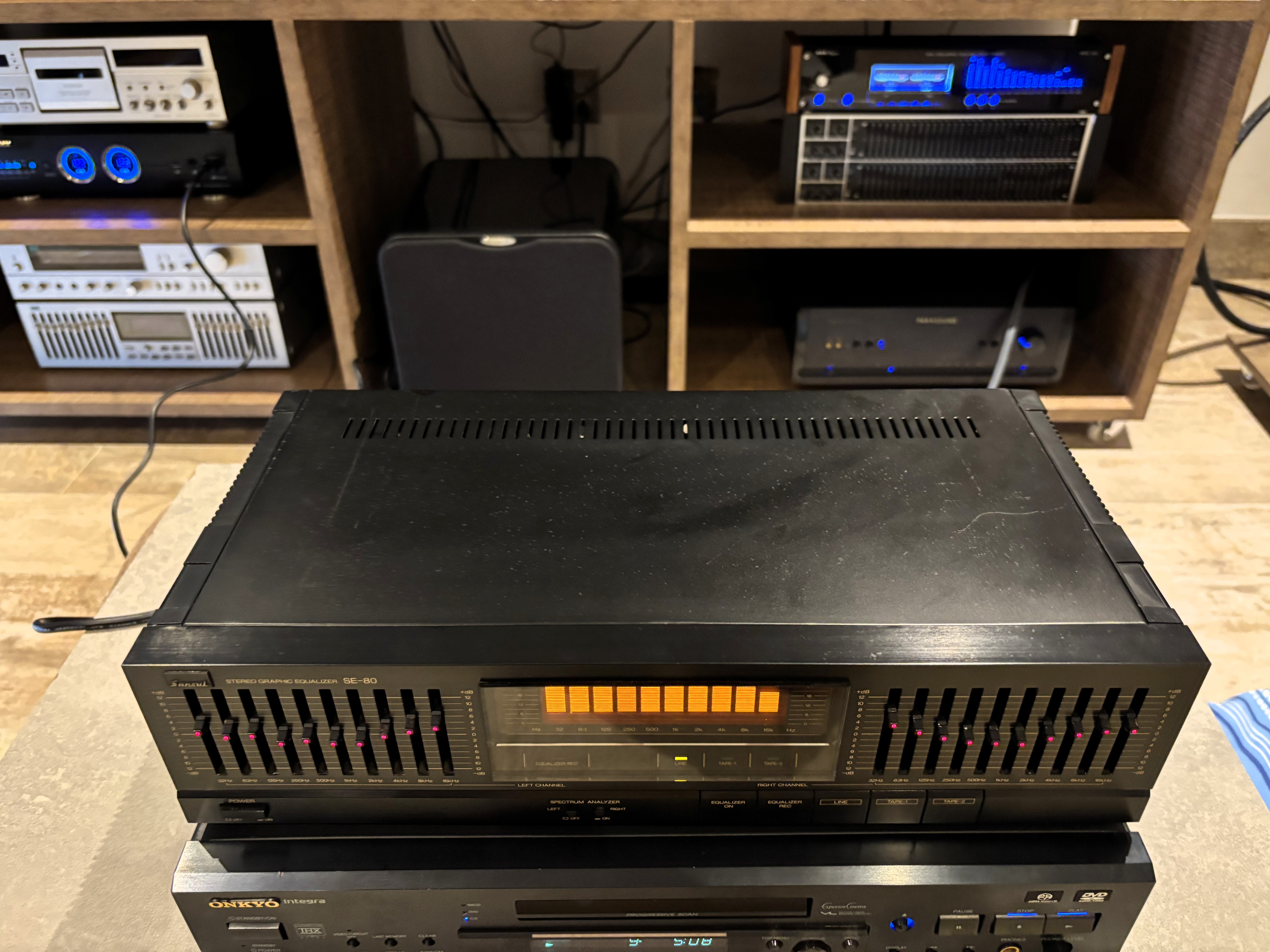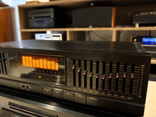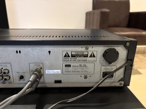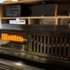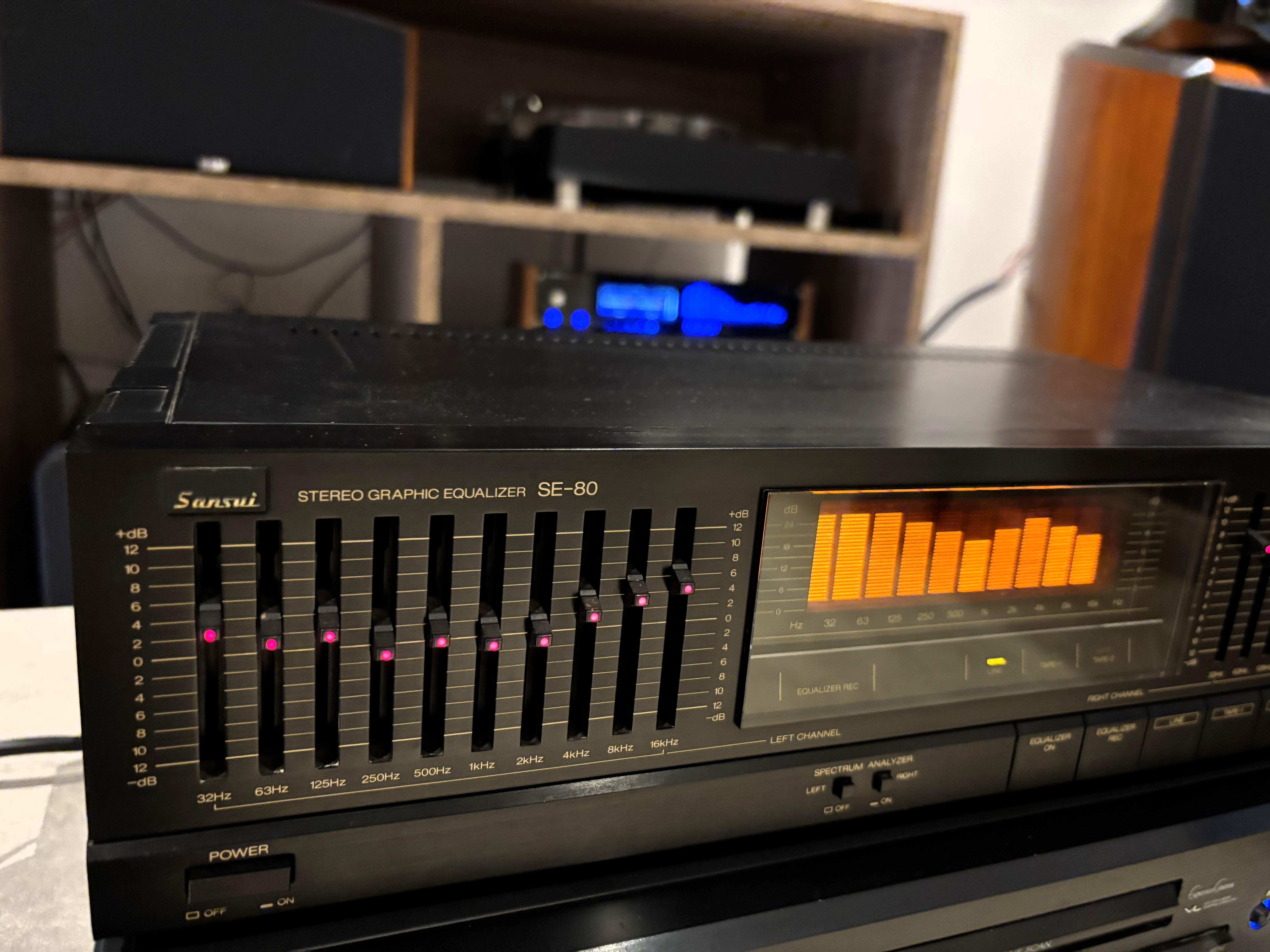 Lindo equalizador gráfico made in Japão pela SANSUI, modelo SE 80 com 10 bandas em cada canal, potenciômetros com iluminação em leds vermelho, e analisador de espectro na cor amarela.