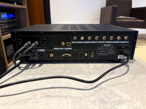 Saídas: Uma saída de áudio analógica de 7.1 canais, duas saídas de áudio analógico estéreo (um conjunto balanceado via XLRs, um conjunto de terminação única via conectores RCA), duas saídas de áudio digital (uma coaxial, uma óptica), duas saídas HDMI (pode ser configurada para saída de vídeo em uma porta e saída de áudio na outra), uma saída
